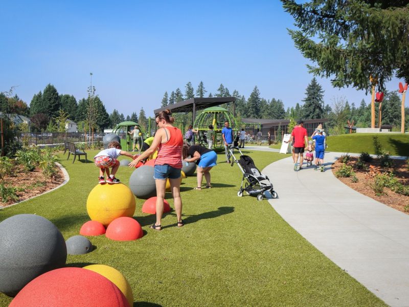 Scope included natural play features, a sand and water play area, specialized runnel paving, naturalistic plantings, flexible lawns, pathways and trails, a fitness area, a place space for pop-up activities, a games area, shade structures, picnic pavilion, restrooms, parking and open spaces filled with climate-adapting landscaping and native restoration plants.