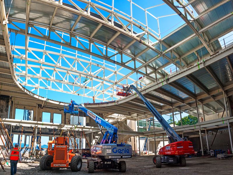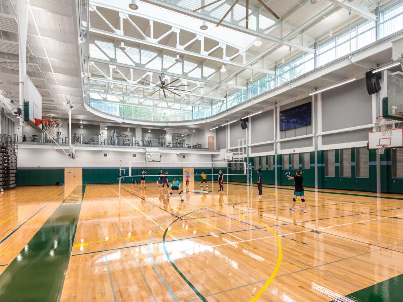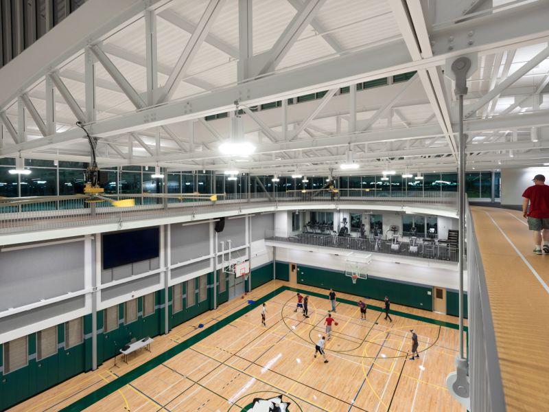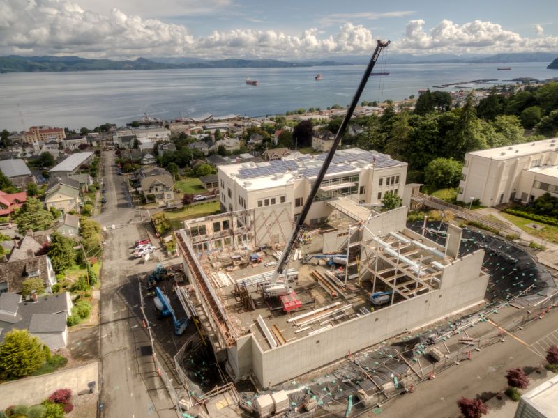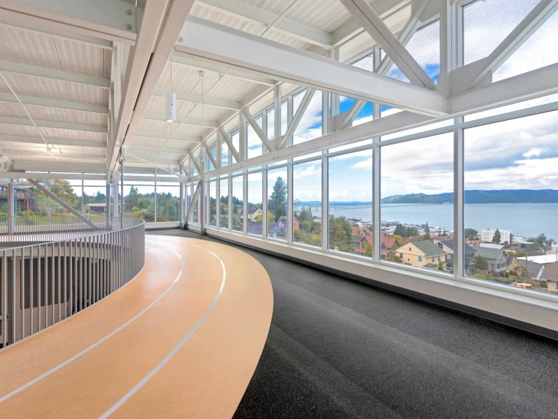 Winner of the DJC TopProjects 2018 High Performance Building Award, the reconstruction of Clatsop Community College's historic Patriot Hall involved selective demolition of the circa 1920's concrete and wood structure, preservation of the existing foundation and building retaining walls, and construction of a new concrete and steel building. The new building provides the college and community with a gymnasium with seating for 500, an indoor running track and athletic workout rooms, classrooms, and administrative spaces for staff.