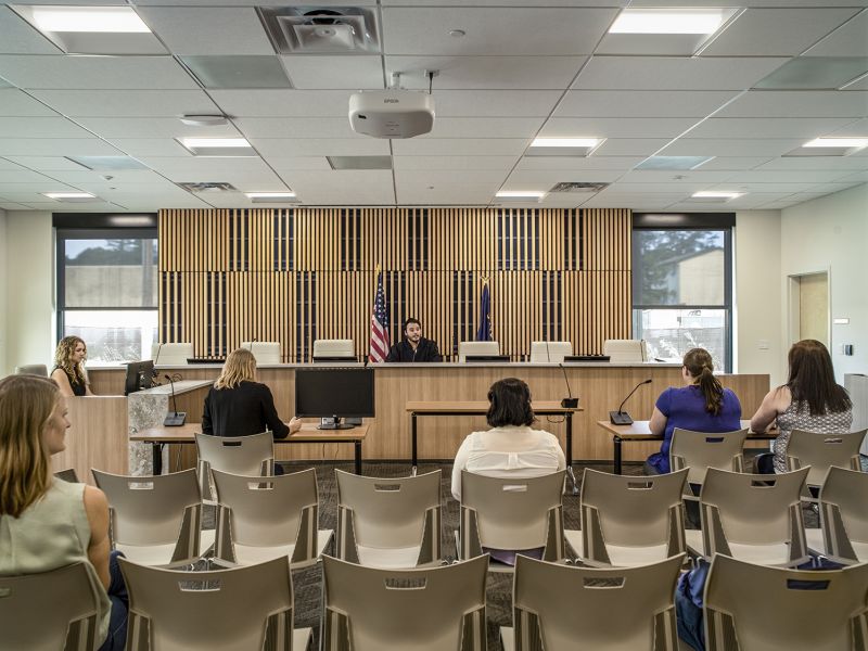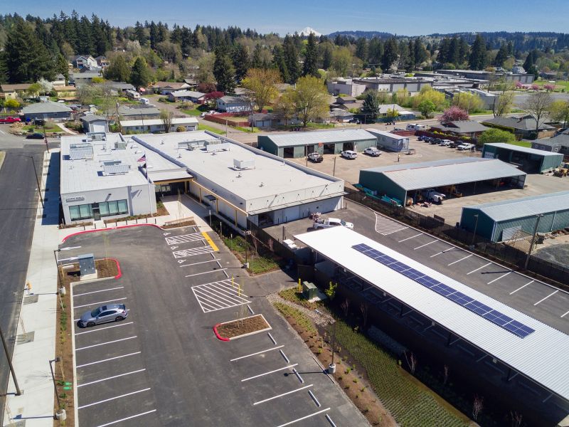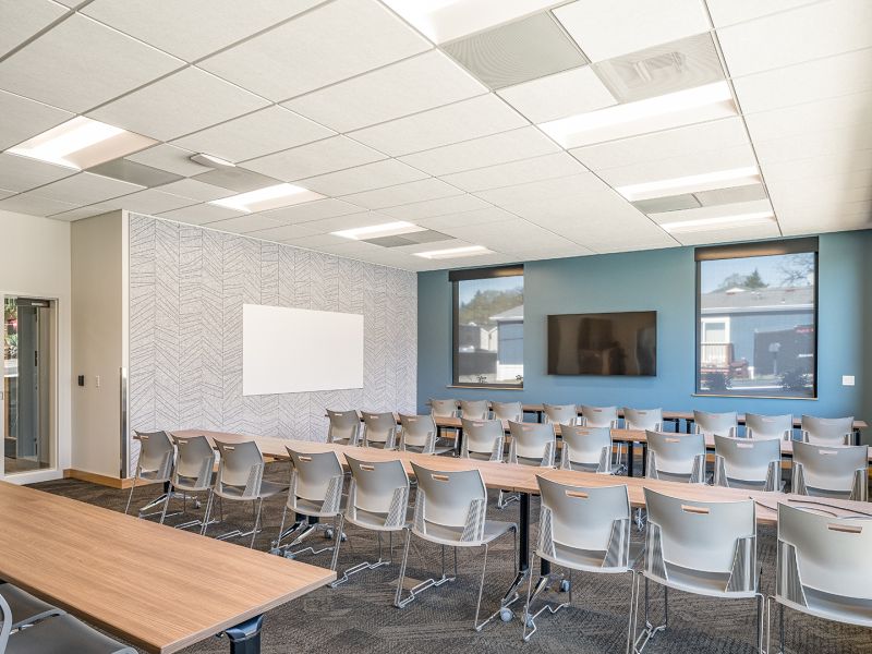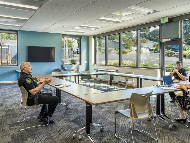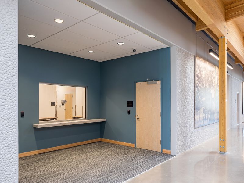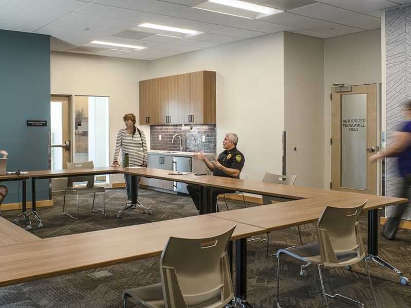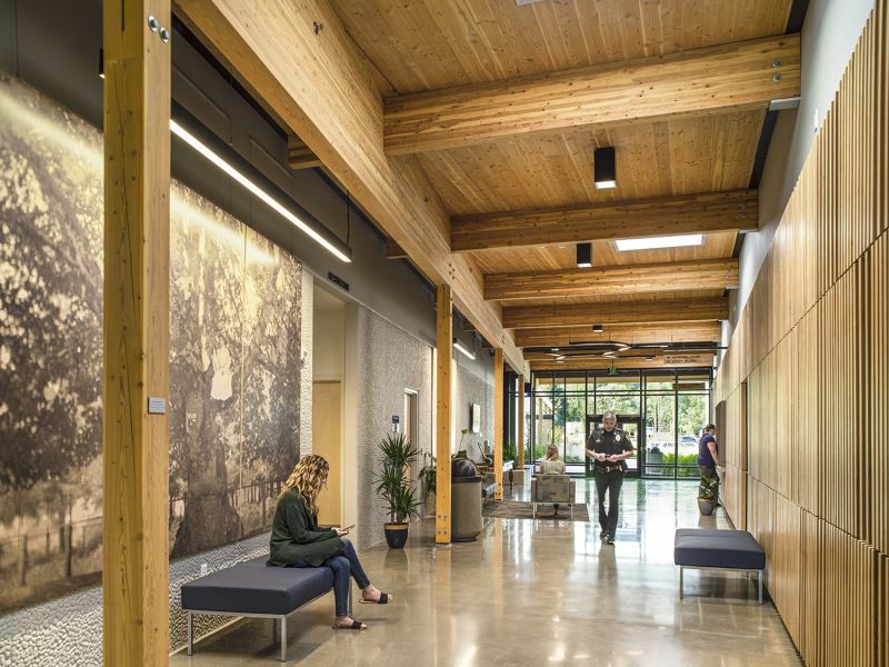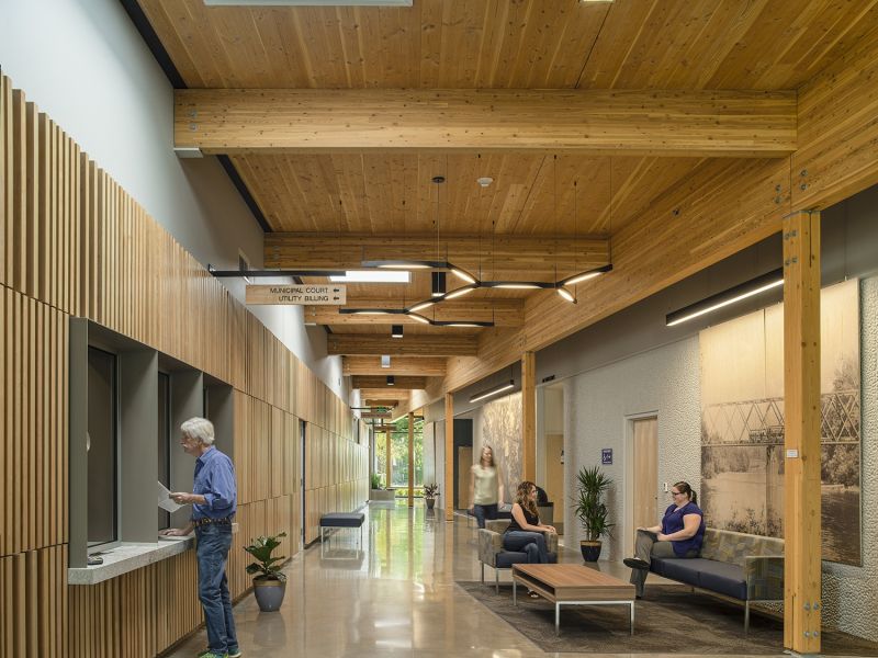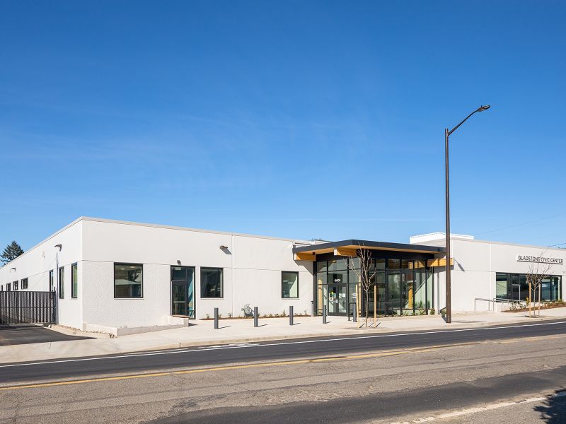 Built on a 2-acre site next to the City’s Public Work Facility, the brand new 22,000 sf building was designed and constructed using a progressive design-build contracting method. The facility includes a pair of one-story concrete tilt-up buildings containing both city hall and police functions. The northern building houses Gladstone’s City Hall and community rooms and the southern building houses the police department. Each building is connected by a lobby that’s filled with natural light and features exposed cross-laminate timber (CLT).